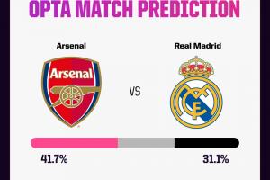 枪手稍被看好!Opta预测欧冠首回合:阿森纳胜率41.7%,皇马31.1%