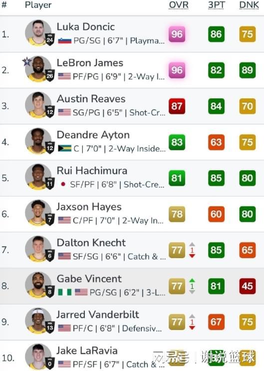 作为联盟头号流量大队,洛杉矶湖人自然被重点提及和关注,从网上晒出的图片,我们可以看到湖人球员,下赛季2K能力值排名。两大核心勒布朗-詹姆斯和卢卡-东契奇,都是96的总评分并列榜首,相反布朗尼-詹姆斯直接垫底。