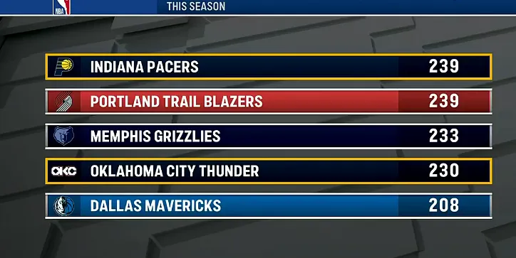 步行者和开拓者239人次最多,灰熊233人次、雷霆230人次、独行侠208人次。