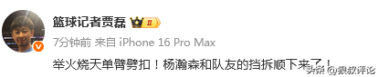 媒体人“周鹏Daveeeeee”发文点评:瀚森隔扣对手!!!全场球迷起立欢呼!!!这氛围太好哭了!!!