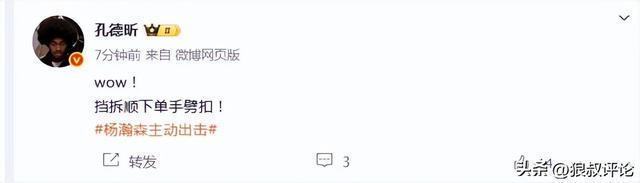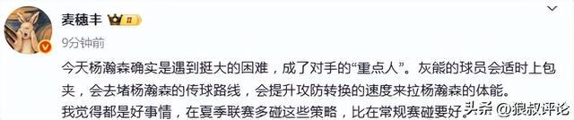 本场比赛参与解说杨鸣点评说道:杨瀚森还是受到背靠背体能影响,稍微有一点脱节,但还是用自己方式在打球,所有球都是合理的,现在是由弱到强过程,还没有碰到又硬又黑,将会可能要面对文班那样的球员。”